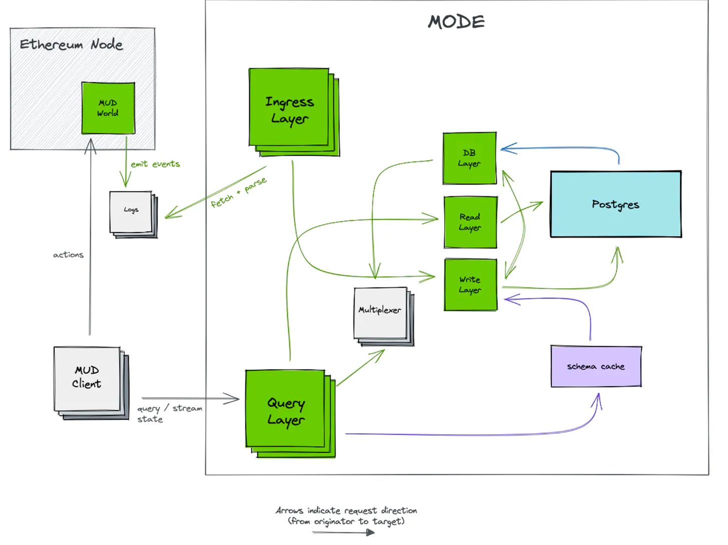 MODE模块极大的降低游戏客户端对状态查询的复杂度,帮助开发者屏蔽了原始的全节点交易明细拆解。主要核心功能: 高效的store索引,依赖特殊客户端Node https://mud.dev/mode [PostgresDB]