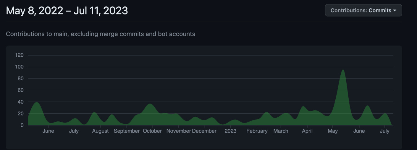通过分析github代码库的统计指标,我们可以看出来今年4月份以后代码的更新度变的活跃起来,最高一个月有将近100次的贡献记录。目前大概有39名活跃开源贡献者,alvrs 和holic是贡献最多的俩名作者。
