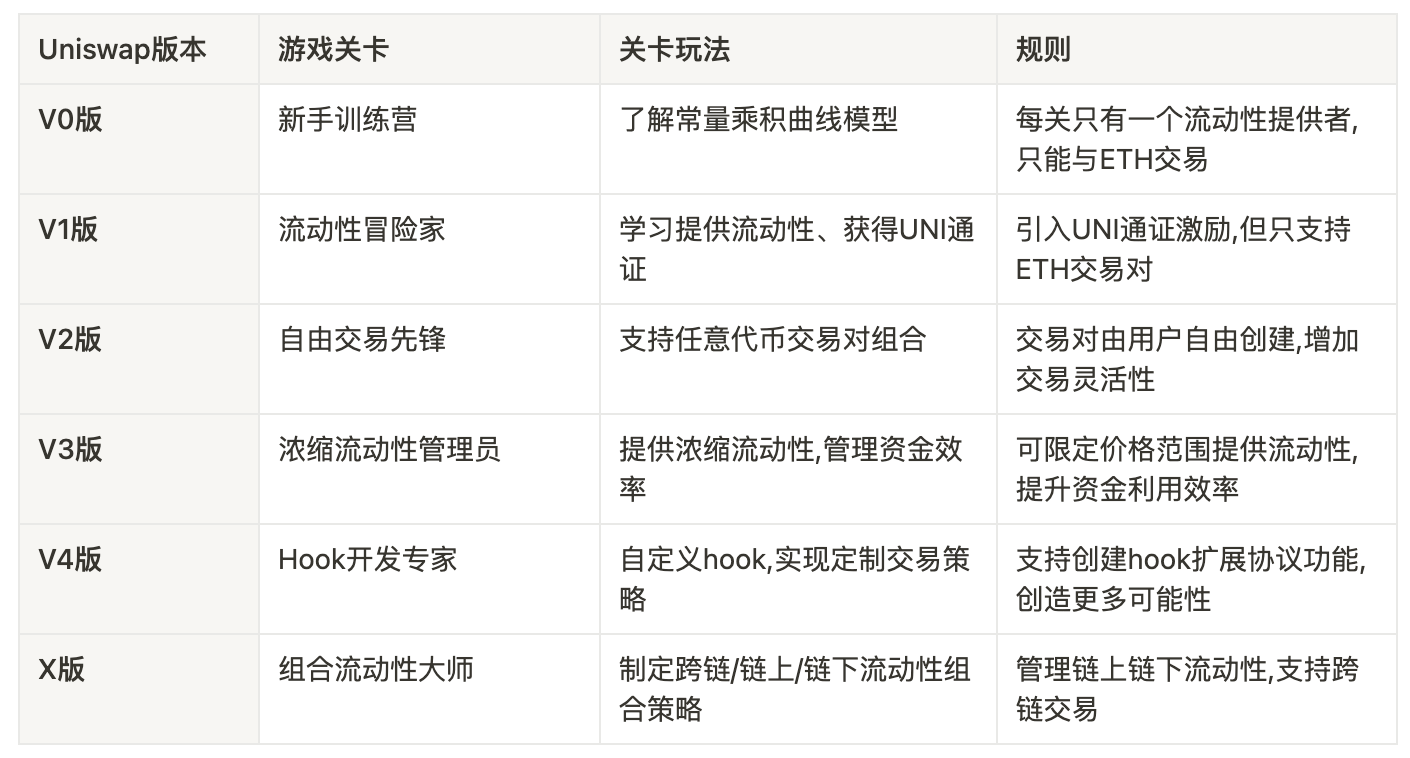 只有不断学习和适应,才能在这个不断升级的游戏世界中获取更大的收益与支配力。下面我们一起看看Uniswap中不同版本对应的游戏关卡: