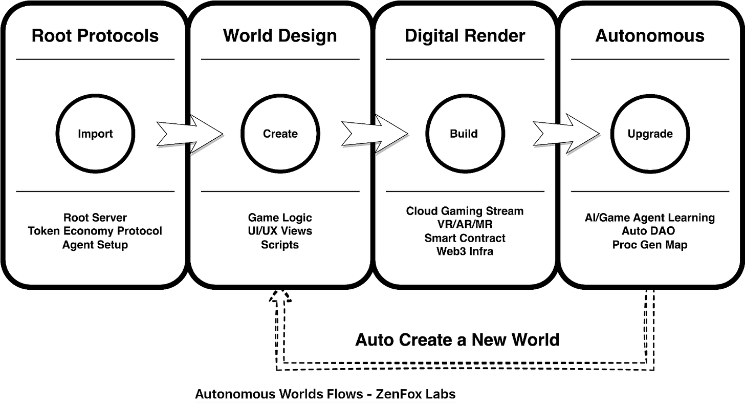 IAW概念希望在Web3游戏基础上突破现有规则局限性,基于新的计算平台、高级人工智能技术探索一个规则透明、地图实时渲染、机器代理交互的的进化式数字世界(包含游戏但不局限于虚拟游戏)。根据这个设想,本文提出了IAW无限自主化游戏的生命周期和流程构建,进一步细化拆分每个环节的定义以及实现的核心技术支撑,主要有以下四个环节: