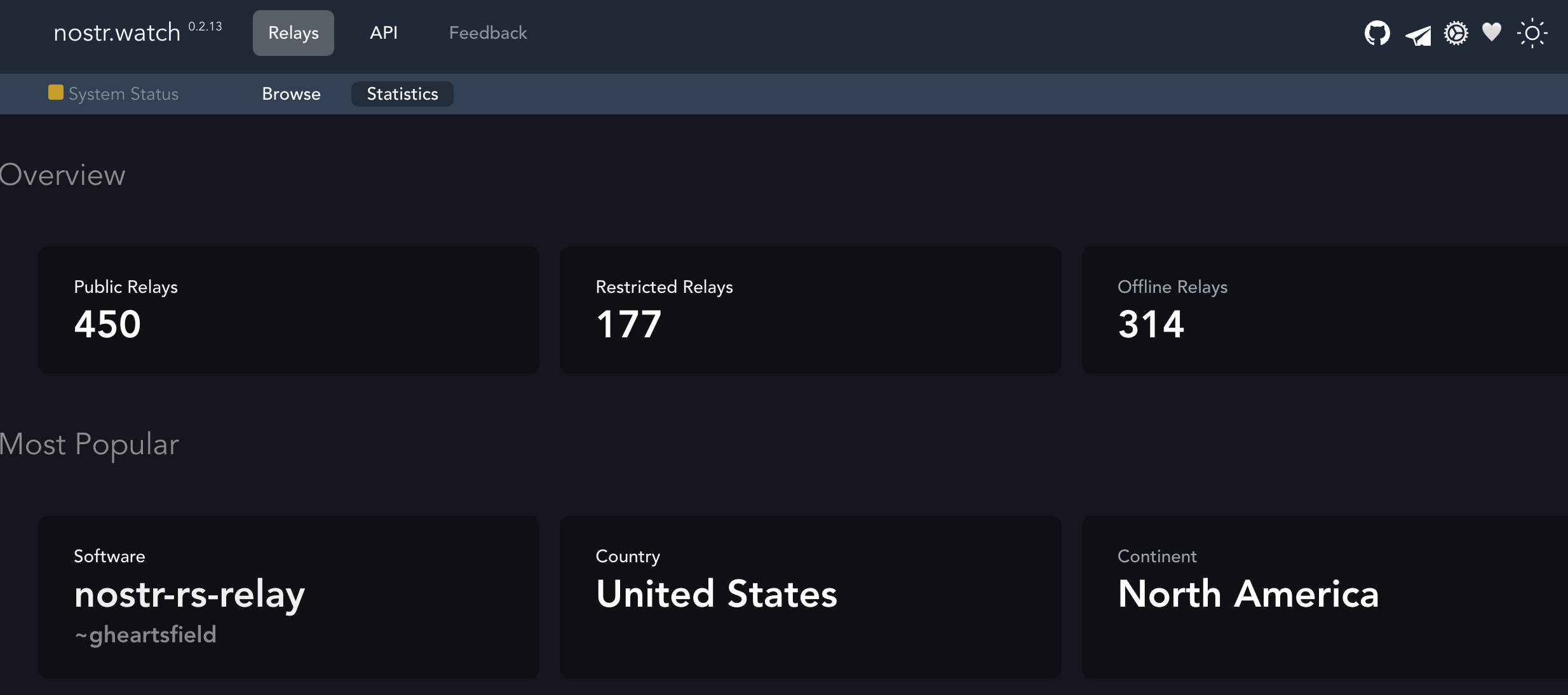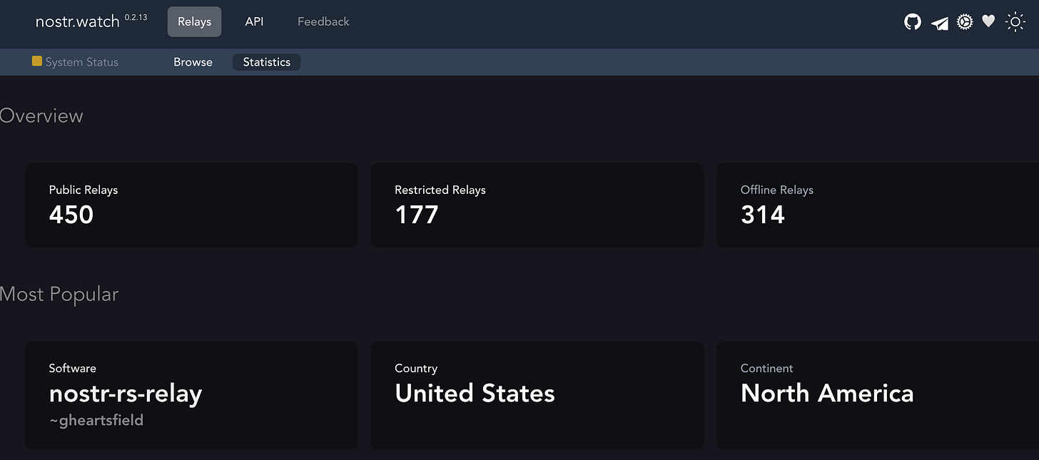 根据在线统计工具Nostr.watch 。目前全网有450个公开中继节点,其中有314个节点处于下线状态。可以看出,由于没有激励惩罚层,中继节点的可靠性是一个待解决的问题。