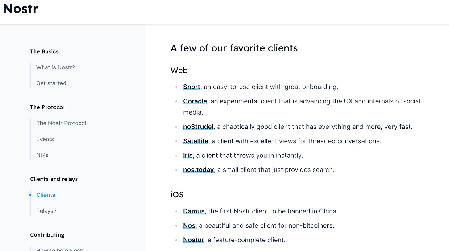 目前Nostr的客户端发展速度很快,已经支持多种移动平台,包括Web/Android/Desktop等,相继有20+ 客户端上线。不过大部分客户端的功能比较单一,离生产级别的社交应用还有很大的差距。