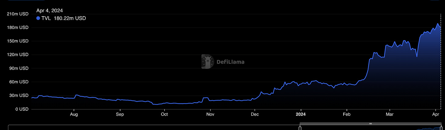 目前由于Nakamoto升级未完成,整体合约和交易的性能偏低,因此Stacks 开发者没有预想的那么活跃。不过从铭文开始,BTC生态得到了再一次的关注,Stacks的TVL在2024年也实现了6倍的增长,到达了180M美金。